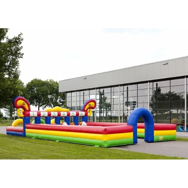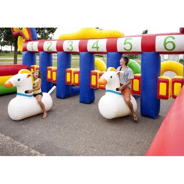 De Hobbelpaard Race Western is een wedstrijdelement waarbij deelnemers plaatsnemen op grote, stevige skippy paarden en zo snel mogelijk over een parcours moeten racen. Deze opblaasbare skippy paarden zijn speciaal ontworpen voor competitiegebruik: extra sterk, stabiel en geschikt voor intensief gebruik tijdens groepen en evenementen. Door het gekke stuiteren en de uitdaging om balans te houden, ontstaat een enorm leuke en ludieke strijd die toeschouwers minstens zo hard laat lachen als de deelnemers zelf.