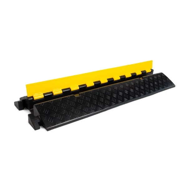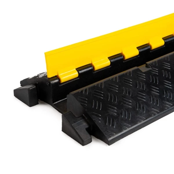 Wanneer een voertuig of voetganger over de kabelbeschermer rijdt, verdeelt het rubberen materiaal de belasting over een groter oppervlak, waardoor de kabels en draden worden beschermd tegen beschadiging. Het ontwerp met een laag profiel zorgt ervoor dat de kabelbeschermer gemakkelijk overreden kan worden en niet te veel opvalt op de grond.