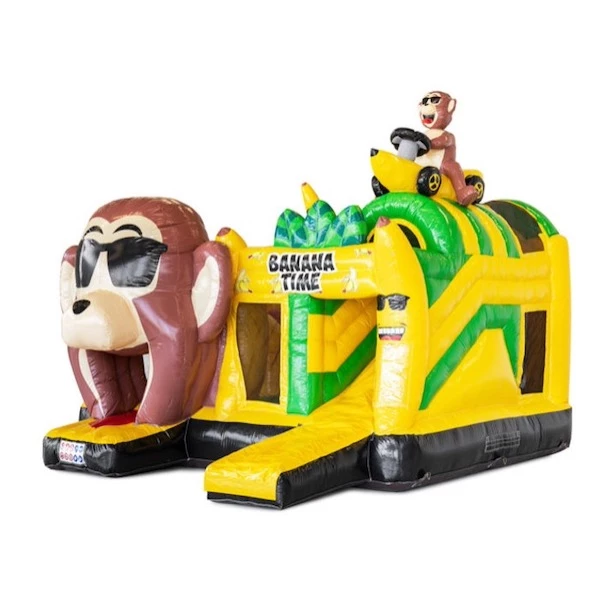Het Banana Monkey springkussen is uitgevoerd in een vrolijk jungle-thema met bananen en apen. Kinderen kunnen klimmen, springen en glijden – een complete speelervaring in één kussen! Dankzij de overdekte constructie is het springkussen ook bij minder goed weer inzetbaar, ideaal voor elk seizoen. Met speelelementen binnenin en een gave glijbaan aan de zijkant biedt het meer dan een standaard springkussen: dit is een echte multiplay ervaring.