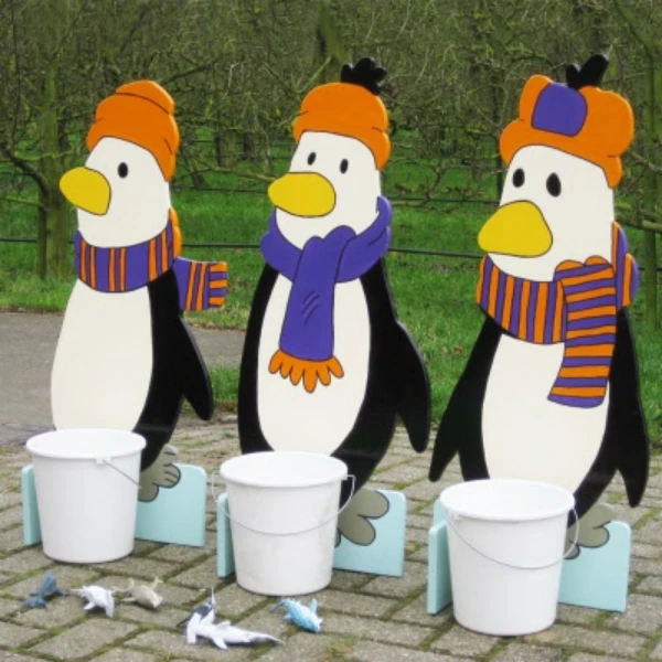 Zet voor iedere pinguïn een witte emmer.Afhankelijk van de leeftijd van de kinderen bepaal de afstand van gooien.Probeer de visjes in de emmer te gooien. Diegene die de meeste visjes in de emmer gooit is de winnaar