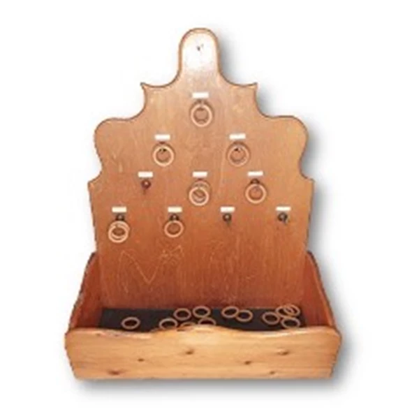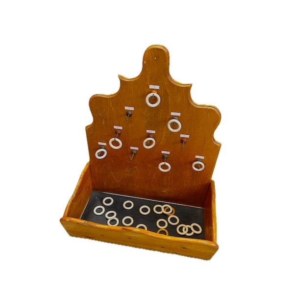Een ringwerpbak is een houten spelbord met verschillende pinnen of staafjes waar je ringen omheen moet werpen. Elke pin heeft een puntenwaarde, en het doel is om met een aantal ringen zoveel mogelijk punten te scoren. Je kunt individueel spelen of in teams, en het spel kan gemakkelijk worden aangepast aan verschillende leeftijden en moeilijkheidsgraden.