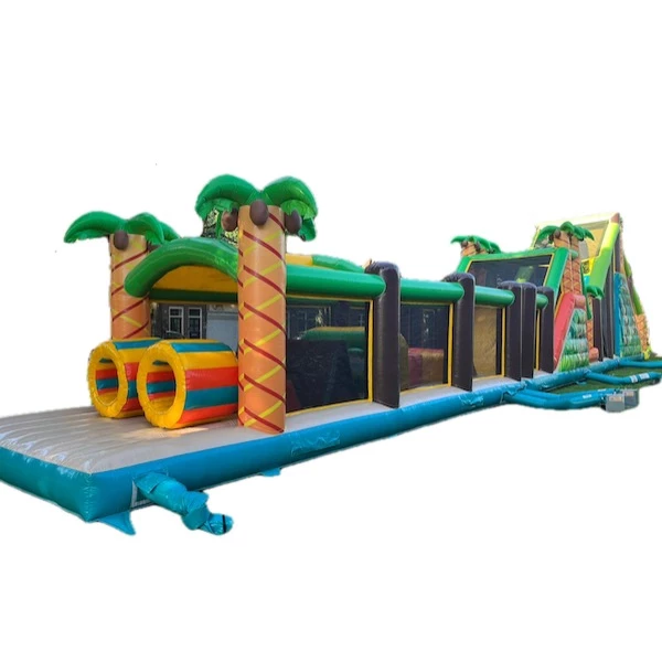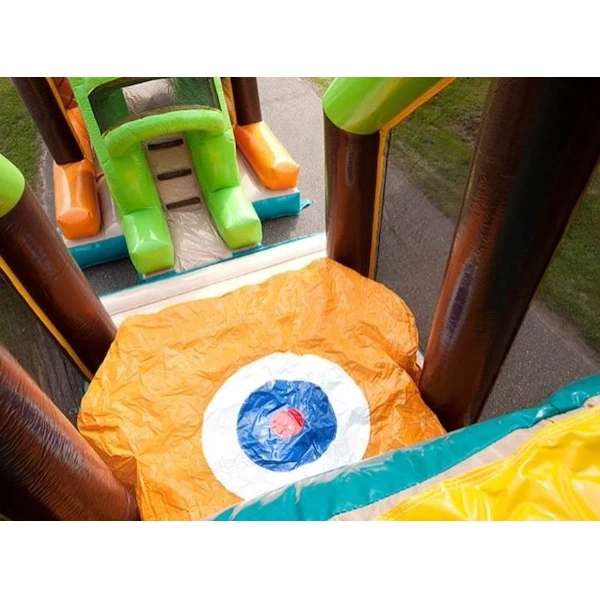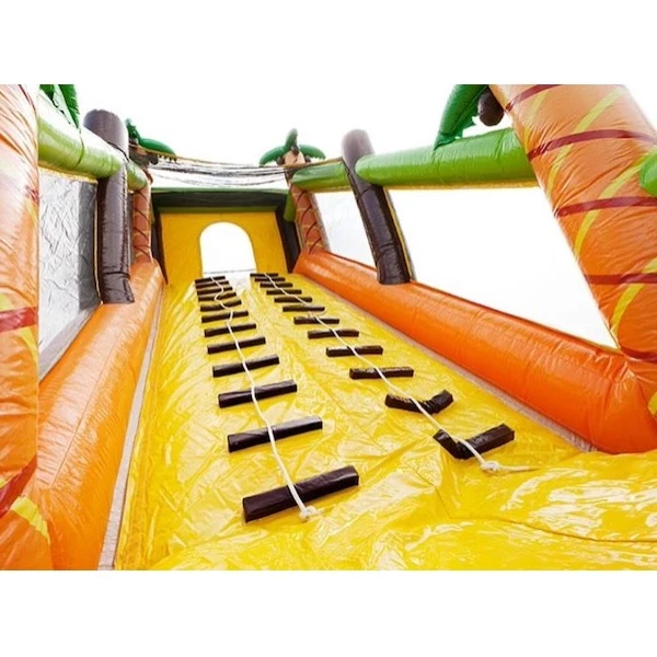 De Jungle Track stormbaan is volledig uitgevoerd in een avontuurlijk jungle-thema, compleet met tropische kleuren, palmbomen en dierenprints. De deelnemers banen zich een weg over klimmuren, door kruiptunnels, glijbanen en hindernissen die zorgen voor een gevarieerde en energieke ervaring. Dankzij de extra lengte van 31 meter is het parcours uitdagender dan ooit – perfect voor competitieve spellen of estafettes.