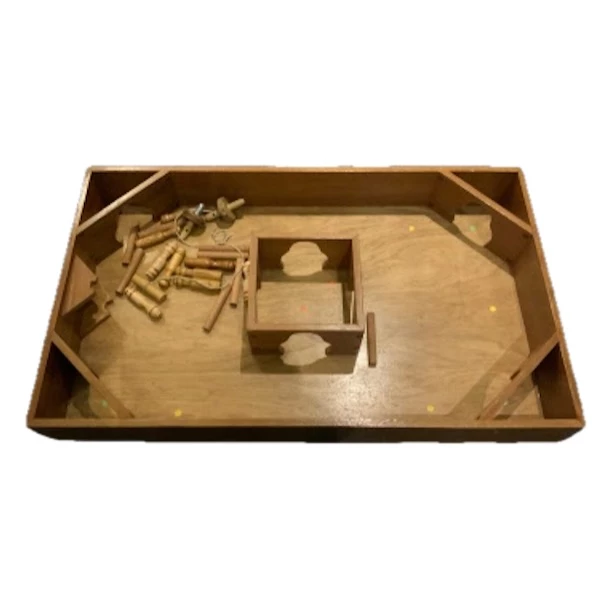 Plaats alle 10 kegels op de daarvoor bestemde gekleurde stippen. Draai het touw om de tol heen door het gat. Trek hierna met een stevige ruk aan het koord van de tol. De tol zal zijn weg vinden in de bak, en een aantal kegels omstoten.